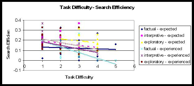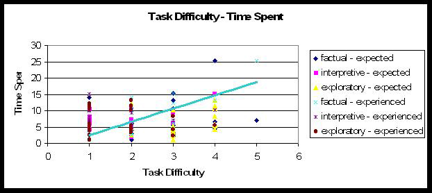 TCDL Bulletin Task Difficulty in Information Searching BehaviorExpected Difficulty and Experienced DifficultyJeonghyun Kim This is becoming an axiom: information systems should be designed to support users' tasks. Congruently, task-oriented interaction or task-based design and analysis are applied to digital libraries. This is because the type of task that needs to be done is generally considered to play an important role in the user's system interaction. Task difficulty is one of the task characteristics that influences the way a user approaches information seeking. However, relatively little research has focused on task difficulty relative to a user's perception and judgment. Thus, this study focused on task difficulty with regards to personal perception. The study investigated how task difficulty is related to searching performance in terms of time spent, pages viewed, pages saved, search efficiency, and the number of query reformulations. It assumed that a task predicted to be difficult would require a higher level of user engagement and work during a search. If users invested significant effort to complete a certain task, the task would thus be assessed as difficult. The results of the study show that expected difficulty is a good predictor for search efficiency. It also revealed that search efficiency is a great indicator for experienced difficulty. In addition, it was found that judgment of both expected difficulty and experienced difficulty varies according to the type of search task: factual task, interpretive task, or exploratory task.