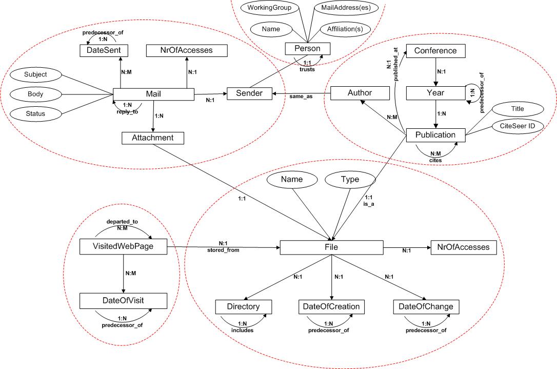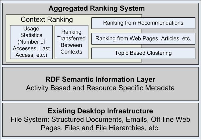 Existing Desktop Infrastructure. People make use on their desktops of all the available tools: email, file hierarchies and web caches, but sometimes just using these separate resources is not enough. In order to be able to store and find information, we want to have connections among them and use them directly. To keep these relations, we propose to explicitly represent this information in an application-independent way as RDF metadata, to enable both enhanced search capabilities, as well as the exploitation of the semantic links between desktop files. (e.g., PDF articles stored from attachments). RDF Semantic Information Layer. As we just saw, most of the information related to our activities currently is lost on our desktops. The aim of this layer is to represent and record this data in RDF annotations associated to each resource. The stored RDF data can be very simple: "author" for an email, "URL" of a web page, or metadata that builds the semantic connections between resources: an email "has attachment", a file can be "stored from" a web page, we can arrive at a visited web page from another. Aggregated Ranking System. As the amount of desktop items has been increasing significantly, desktop search applications return more and more hits to our queries. If we also take the contextual metadata into account, the results will increase in number even more. A measure of importance that enables us to rank these results is therefore necessary. We propose a basic ranking scheme, based on the ObjectRank [3] idea, enhanced with personalization of trust in resources and links. The next section presents the main research questions answered in this thesis proposal, illustrated by some related work. The main contributions of our work are further presented, divided into the presentation of the exploited contexts and their ontologies (Section 3), the added ranking system (Section 4) and the current Beagle architecture and how we can achieve a syndicated view upon data using the proposed ontologies, especially from the web cache (Section 5). Finally, Section 6 concludes our work and lists some areas for further improvements. 2. Research Questions & Related WorkHow Do Users Search on the Desktop? The difficulty of accessing information on our computers has prompted several first releases of desktop search applications, such as Google desktop search [16] and the Beagle open source project for Linux [14]. Yet they include no metadata whatsoever in their systems, only regular text-based indexes. Nor does their competitor MSN Desktop Search [20] include metadata. Finally, Apple Inc. has integrated an advanced desktop search application (named Spotlight Search [2]) into their new operating system, Mac Tiger. Even though they also intend to add semantics into their tool, only explicit information is used, such as file size, creator or metadata embedded into specific files. In my thesis I focus on how to enhance search using a variety of contextual information often resulting or inferable from explicit user actions or additional background knowledge. How Do We Rank Resources on the Desktop? Ranking resources on the desktop is difficult, because we don't have enough relations between them, as on the web. There have been several papers on ranking in the context of semantic web such as Swoogle [9], a search and retrieval system for finding semantic documents on the web. The ranking scheme used in Swoogle uses weights for the different types of relations between Semantic Web documents to model their probability to be explored. However, this mainly serves for ranking between ontologies or instances of ontologies. The importance of semantically capturing user's interests is analyzed in [1]. The purpose of their research is to develop a ranking technique for the large number of possible semantic associations between the entities of interest for a specific query. They define an ontology for describing the user interest and use this information to compute weights for the links among the semantic entities. An interesting technique for ranking the results for a query on the semantic web takes into consideration the inference processes that led to each result [21]. In this approach, the relevance of the returned results for a query is computed based upon the specificity of the relations used when extracting information from the knowledge base. In my thesis I am focusing on PageRank-like algorithm models applicable for the relationships between resources through contextual information. How Do We Generate the Metadata Structured in Ontologies? Our approach builds upon the idea of a semantic desktop, realizing a unified view upon the resources involved in a certain activity. In [18], the authors describe an approach for personalized content syndication, featuring a central content syndicator instance that answers user requests. Our approach differs from this approach, as we do not focus on content brokerage but on metadata brokerage, and incrementally construct metadata that we use for modeling a user's context and preferences. A related approach creating metadata descriptions on behalf of a web extraction process is described in [5]. The author creates RDF descriptions about publication information from dedicated sites in an automated process, as well as new views on the data based on these descriptions and additional background knowledge available for this application. In the following sections we will discuss the aspects concerning the exploited contexts in the desktop search and the generated ontologies, the ranking of resources and the metadata generation, based on what we described in [12, 8, 13, 11, 7]. 3. Contexts & MetadataIn the first two layers of our proposed architecture (see Figure 1), we present the missed contexts available on our desktops, represented by the usage of the physical resources, and the ontologies that emerge from each of these exploitable contexts. In the next sections we differentiate among th