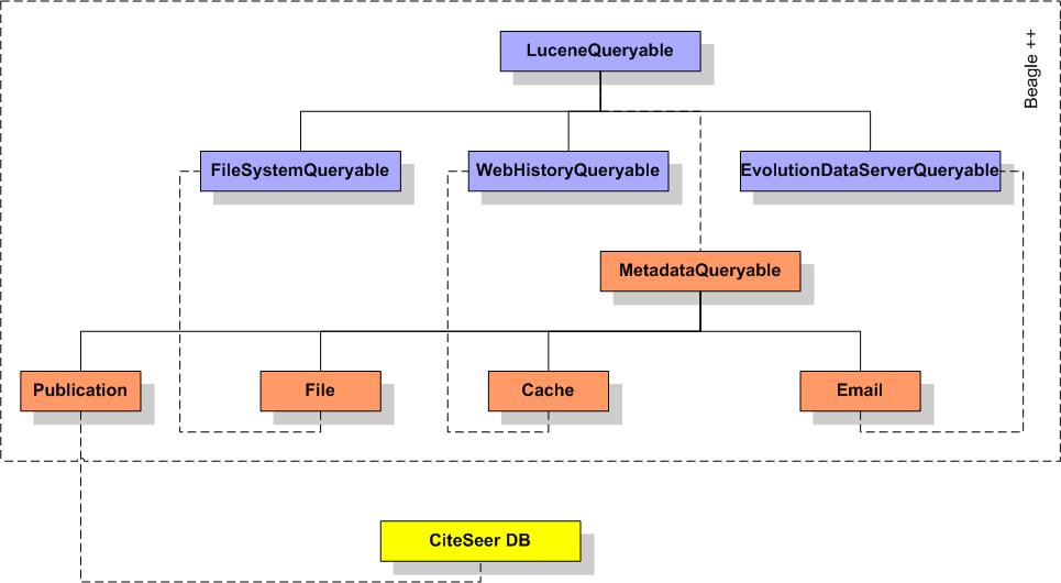 applying the random surfer model and including all nodes in the base set. The random jump to an arbitrary resource from the data graph is modeled by the vector e, which contains an entry for each resource appearing in the data graph. In the original PageRank/ ObjectRank formula, the probability of reaching a certain resource through a random jump is evenly distributed among the resources, and therefore, the e vector has only "1" values. Parameter d in the equation represents the dampening factor and is usually considered 0.85. According to the formula, a random surfer follows one of the outgoing links of the current page with the probability d, and with probability (1-d), he jumps to a random page from the web graph. The r vector stores the ranks of all resources in the data graph. These rankings are computed iteratively until a certain threshold is reached. A is the adjacency matrix that connects all available instances of the existing context ontology on one's desktop. The weights of the links between the instances correspond to the weights specified in the authority transfer annotation ontology. Thus, when instantiating the authority transfer annotation ontology for the resources existing on the users desktop, the corresponding matrix A will have elements that can be either 0, if there is no edge between the corresponding entities in the data graph, or they have the value of the weight assigned to the edge determined by these entities, in the authority transfer annotation ontology, divided by the number of outgoing links of the same type. Additionally, in the case of publications, for the rank computation we also take into account the ratings extracted from the CiteSeer database with the aid of our publication metadata generator. These values are used as seed values for the calculation of the personalized rankings. 5. Metadata GenerationIn this section we present the modality to generate metadata structured in ontologies, using our Beagle prototype. We also show how to syndicate these metadata into semantic views according to the user's activities and interests. 5.1 Current Beagle ArchitectureOur current prototype is being built on top of the open source Beagle desktop search infrastructure, which we extended with additional modules; metadata generators, which handle the creation of contextual information around the resources on the desktop; and a ranking module, which computes the ratings of resources so that search results are shown in the order of their importance. The advantage of our system over existing desktop search applications is both the ability of identifying resources based on an extended set of attributes more results, and of presenting the results according to their ranking to enable the user to quickly locate the most relevant resource.