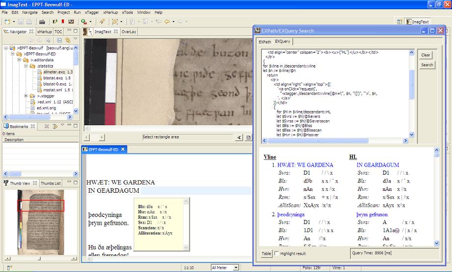 TCDL Bulletin Extended XQuery for Digital LibrariesAlex Dekhtyar, Ionut E. Iacob, Kevin Kiernan, Dorothy C. Porter Documents have, in general, a multihierarchical structure (such as physical organization in the form of pages and lines, content organization in the form of paragraphs and sentences, etc.). Searching multihierarchical XML encoding presents a number of unique challenges for both computer scientists and document experts. We present an extension of the XQuery language suitable for searching multihierarchical XML. Our implementation is part of the Edition Production and Presentation Technology (EPPT) a complex platform for preparing and presenting electronic editions of documents. This platform includes a data model for multihierarchical document-centric XML, an extensive suite of editing tools, and a query language, Extended XPath, for searching multihierarchical documents. Extended XPath, an extension of the XPath query language, offers us the benefit of clear semantics for path expressions over multihierarchical XML. At the same time, to achieve full query language functionality, path expression languages need to be "wrapped" by a declarative query language, such as XQuery. XQuery is an attractive XML query language for document-centric XML processing as it provides built-in support for presentation of query results. EPPT has HTML presentation capabilities and we have enhanced it with an extended version of XQuery FLWOR expressions over multihierarchical XML documents. More information about EPPT can be found at: <http://www.eppt.org>.