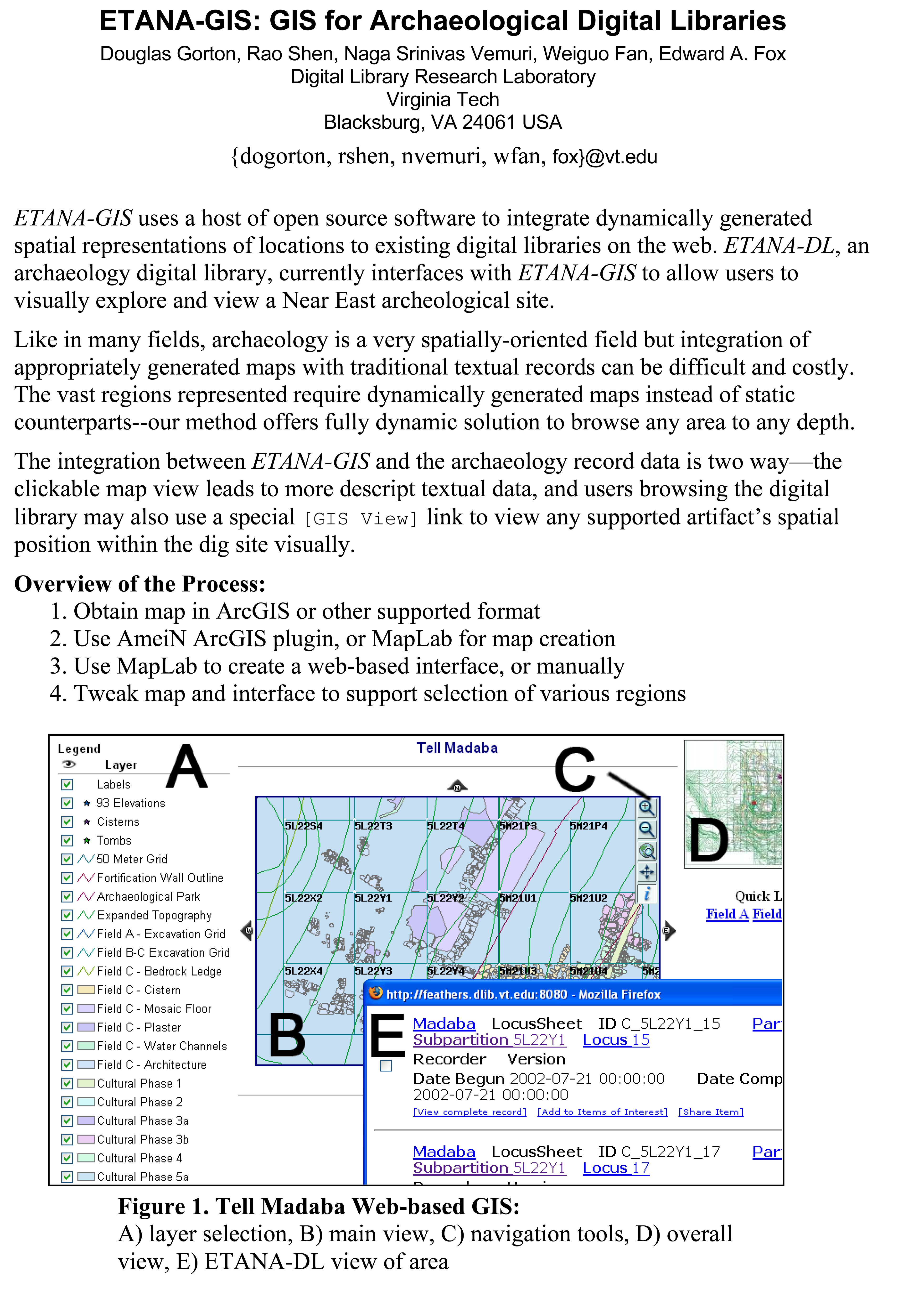 TCDL Bulletin ETANA-GISGIS for Archaeological Digital LibrariesDouglas Gorton, Rao Shen, Naga Srinivas Vemuri, Weiguo Fan, Edward A. Fox This work extends the existing ETANA-DL archaeology digital library with a component to display and navigate related Geographic Information Systems data in a web-based context. Like many fields, archaeology is a very spatially-oriented field but integration of appropriately generated maps with traditional textual records can be difficult and costly. The vast regions represented require dynamically generated maps instead of static counterparts our method offers a fully dynamic solution to browse any area to any depth. The method also provides a two-way integration between the two data views the clickable map view leads to more descriptive textual data, and users browsing the digital library may also use a special link to view any supported artifact's spatial position within the dig site graphically. Our method uses a collection of open source software for dynamic image generation of source GIS data and can render a wide variety of vector image formats on the fly.