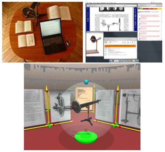 The use of 3D representations for digital document management is slowly gaining acceptance. The 3 major desktop interfaces (Unix, Windows Vista, Apple Mac OS) now offer such tools for basic windows manipulations. Using a similar approach for the in-depth reading of digital books has been investigated in [1, 2, 3]. Another field where the 3D visualisation technologies appear naturally is digitization for the museums. This last type of application makes particularly necessary the use of textual metadata, but their presentation remains completely isolated from the interfaces of navigation within the collection of 3D objects. It therefore seems interesting to study the coexistence of textual documents and 3D objects within one single environment of visualization. Our potential field of application is digital libraries for the history of technology, where one would like to be able to associate machines or scientific devices, for example, and the works which describe them. We are interested in particular in the situations where this type of contextual association is not conceived a priori, by the author of a hypermédia, but a posteriori by a reader who has access to several sources of information that he/she compares.