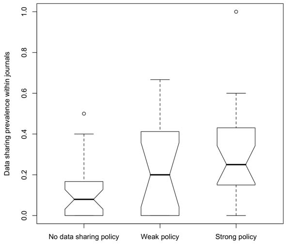 Figure 1. A boxplot of the relative data-sharing prevalence for each journal, grouped by the strength of the journal’s data-sharing policy. For each group, the heavy line indicates the median and the box encompasses the interquartile. NOTE: Prevalence analysis has not been restricted to data-producing articles, and so must be considered relatively and not to an absolute of 100%. Reproduced from [3].