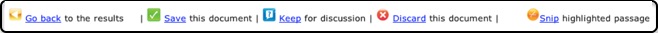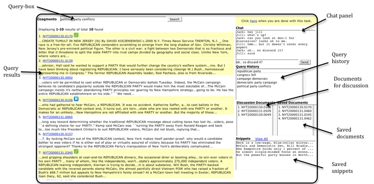 I have implemented a prototype of a CIS system, called Coagmento. In addition to a typical search engine interface, this system includes a set of tools that one can use to collaborate with another user. A snapshot of this interface is shown in Figure 1. As we can see, the interface includes some familiar features of a typical search engine such as query box and results list. In addition, on the right side there is a chat panel, which the user can use to interact with his partner. Below this panel is a list of queries that either of the users ran during a given session. Clicking on a query in this list brings up the results for that query. The main function of this query box, however, is to provide a quick reference to the queries already tried by the team. Below the query box are boxes for documents under review and documents that are found relevant. When a user views a document, he can decide to save it or move it to ‘Discussion’ box for his partner to look at it. These documents can easily be seen by clicking on them in the given boxes. While viewing a saved or kept document for review, one can also discard it (Figure 2).
