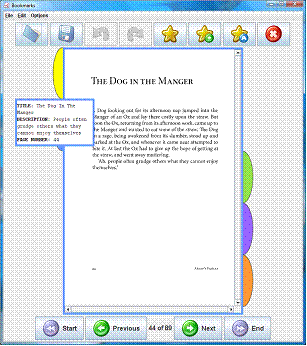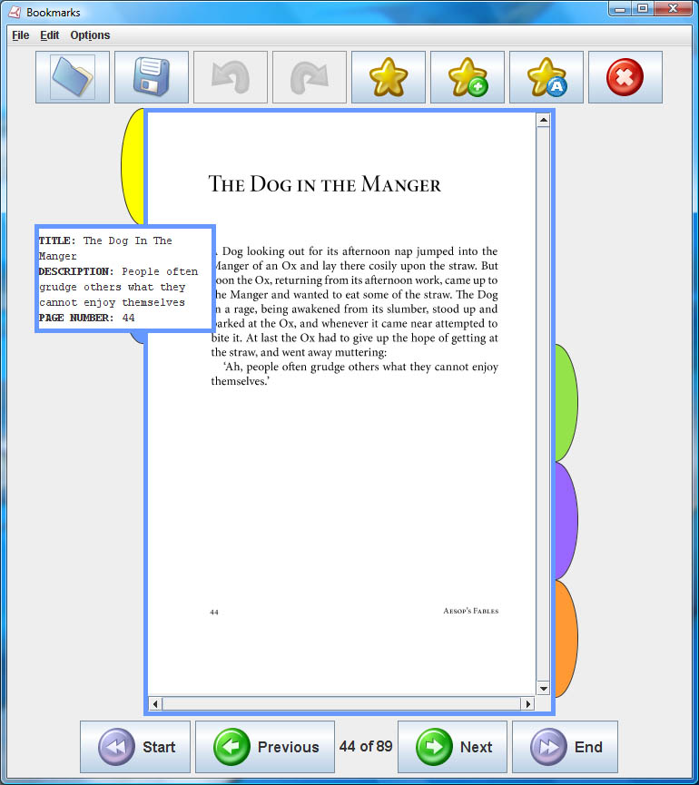 To improve the use of placeholders in digital document readers, a visual approach which uses colour and position has been implemented. To mimic the way standard placeholders are used in books, the visual bookmarking system has used coloured 'Tabs' that stick out of the sides of a document. These 'Tabs' are positioned in the virtual space located on either the right or left hand side of the PDF viewing area. The design of this representation has been modelled in the style of a telephone directory, i.e. bookmarks that occur before the current page appear on the left of the PDF area, whereas bookmarks on the current or later pages appear on the right (see Figure 1). To make the relocation process easier, the tabs are also ordered by page number; so the later the page, the further down the display the tab appears. Thus, a bookmark on page 1 will often appear at the top left corner of the display, whereas a bookmark on the last page will be seen on the bottom right.
