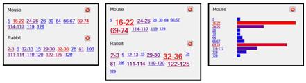 All three of these visualisations use colour to indicate which results contain most occurrences of the keyword; i.e. a gradient from red to blue where red is a 'hot' result (lots of occurrences) and blue is a 'cold' results (few occurrences). The Tag Cloud and Graph interpretations also use size-related cues to visualise keyword occurrences.